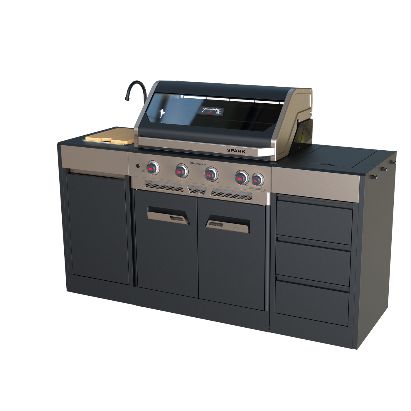 Tilt up preparation table for extra workspace Side Burner with wire trivet for cooking versatility Auto Ignition Burners with backlit LED control dials Convenient chopping board and stainless-steel sink with mixer tap 5 Year Warranty with after sales support Perfect for the all-round entertainer, the Spark Outdoor Kitchen with 4 Burner BBQ is designed for those who want a complete and elevated grilling experience. Whether you’re cooking for the family or hosting friends, the generous 3840 cm² cooking area (800L x 480W) and convenient side burner provide the space and flexibility you need. The Spark Kitchen offers ample storage with three deep drawers and a pull-out preparation table, while the integrated stainless steel sink, bamboo cutting board, and mixer tap make meal prep effortless. Its contemporary design is complemented by durable powder-coated construction, intuitive LED backlit controls, a paper towel holder, tool hooks, and a built-in bottle opener—ensuring you’re ready for any occasion. Searing steaks or grilling vegetables is easy with the satin enamel cast iron cooking surface, which includes a versatile 50/50 split of grill grate and solid plate for optimal control and variety. Built for strength and convenience, it features heavy-duty metal castors for mobility, internal storage with double-skinned doors, and dedicated space for a gas bottle (sold separately). Supplied with an LPG LCC27 hose and regulator, the BBQ is also compatible with Natural Gas when fitted with an approved conversion kit (IN 0718026 Matador Natural Gas Conversion Kit sold separately) installed by a licensed gas fitter or plumber. *Additional Matador Ignite+ Kitchen modules are available for purchase via Special Order to extend your Matador Spark 4 BNR kitchen to suit your space: IN 0847332 Matador Ignite+ Single Module IN 0847328 Matador Ignite+ Double Module (Drawer) IN 0847327 Matador Ignite+ Corner Module IN 0847330 Matador Ignite+ Single Fridge Cabinet IN 0847329 Matador Ignite+ Double Fridge Cabinet IN 0634878 Matador Dark Stainless Steel Bar Fridge Single Door IN 0634877 Matador Dark Stainless Steel Bar Fridge Double Door Dimensions Product Package Width Height Length 630mm 1230mm 1860mm Weight May require help to carry Total Weight 155.6kg Details ColourGun Metal Grey & Black Model NameMatador Spark 4 Burner Gas BBQ Kitchen Model NumberGB0690 MaterialPowder Coated Steel WELS Registration No.T44732 Number of Burners4 WELS Star Rating1780 Regulator TypeLCC27 Fuel TypeLPG 5 Year Warranty We will gladly assist with returns and exchanges of this product in accordance with our returns and exchanges policy. Assembly Required